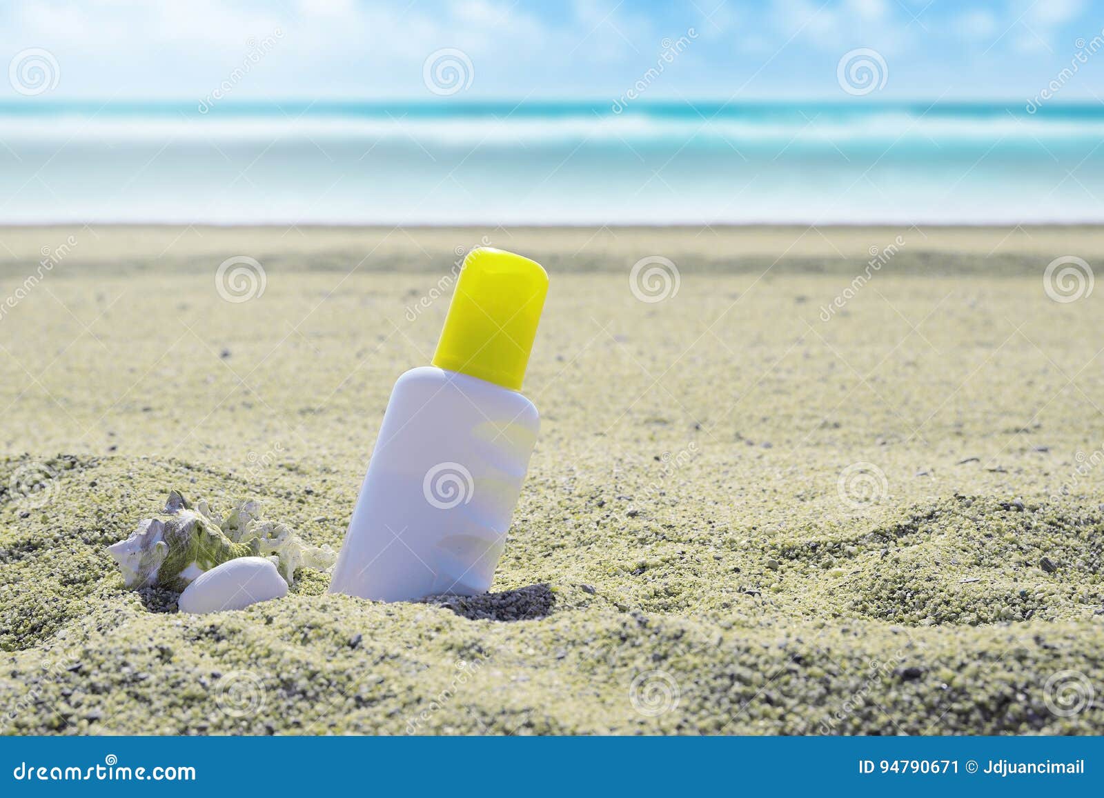 View Full Sunscreen Tube On The Sand Next To The Beach Stock Image Image