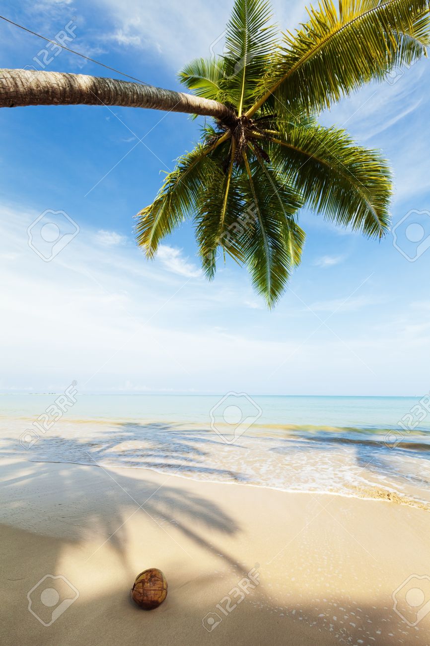 View Full Palm Trees On The Tropical Beach In Sunny Day Vertical Shot