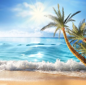 View Full Golden Beach Sea Wave Palm Trees Vinyl Backdrop Background