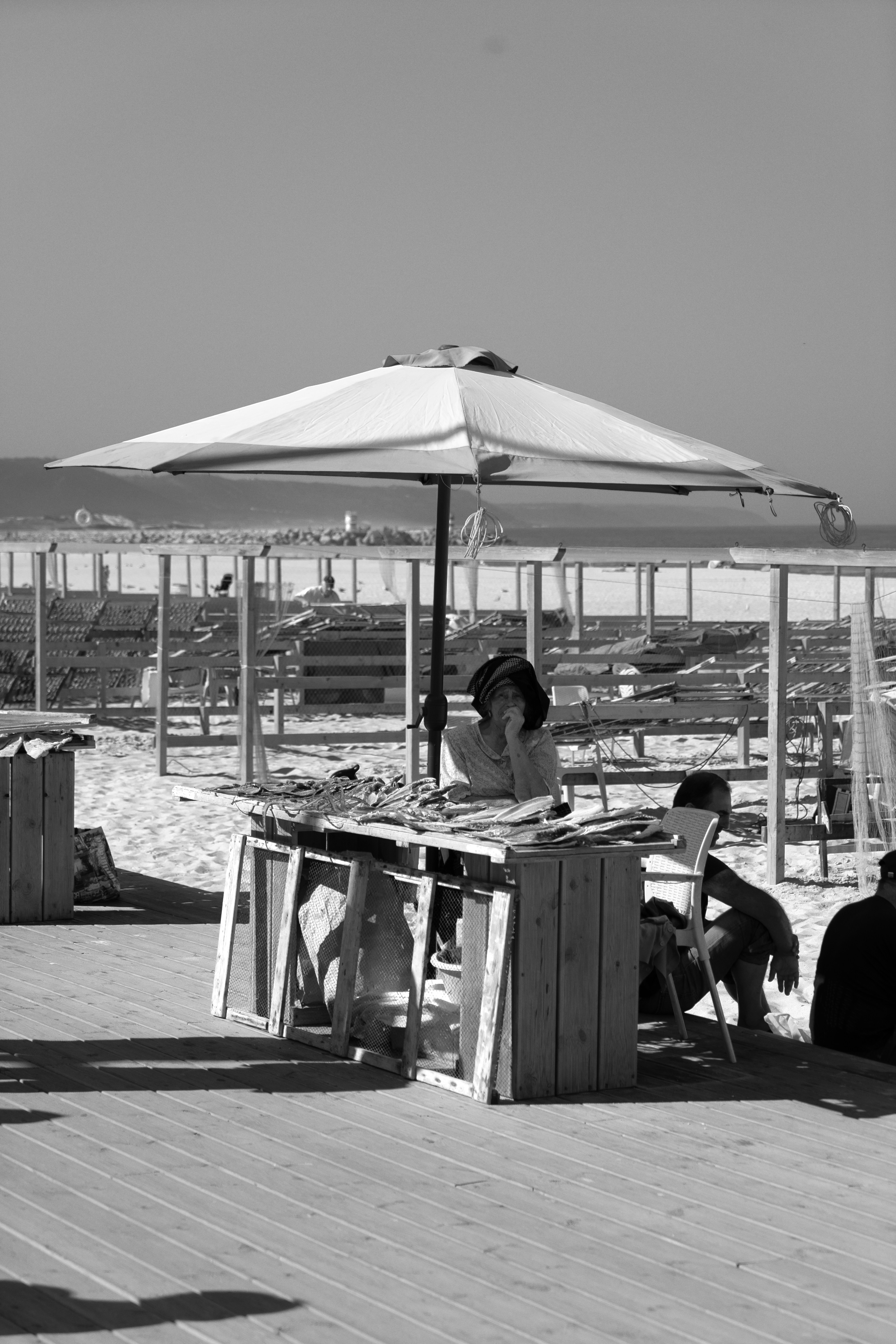View Full Grayscale Photography Of Woman Sitting Under A Beach Umbrella