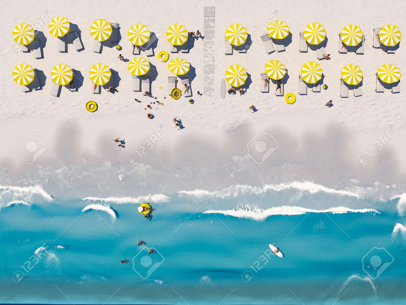 View Full Aerial Top View On The Beach With Lots Of Beach Umbrella 3d