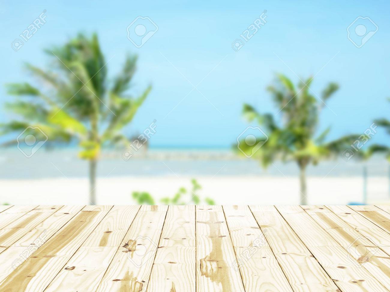 View Full Wood Table Top On Sea Beach Blurry Backgrounds Stock Photo